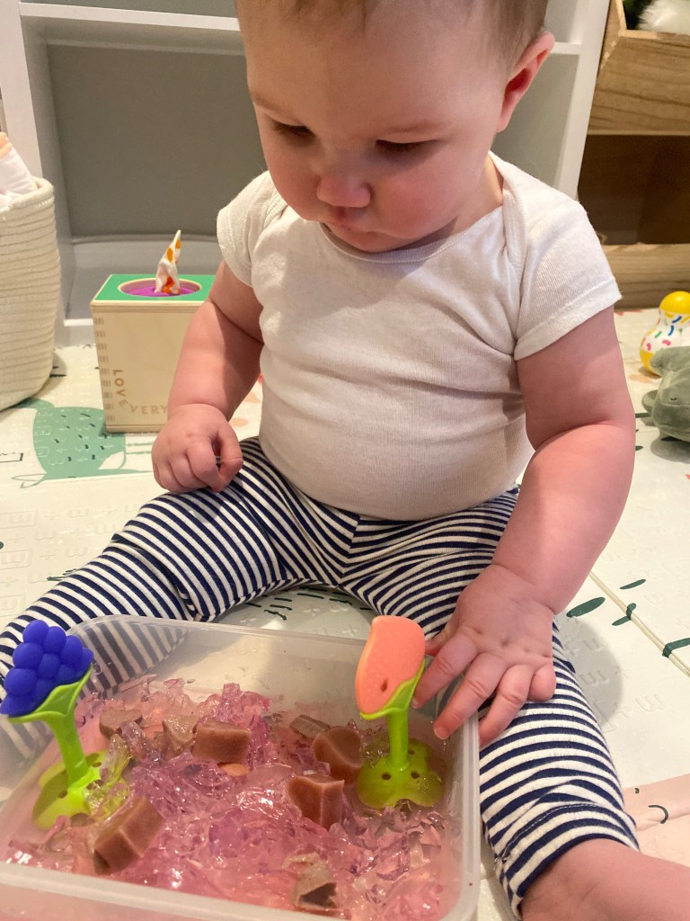 A great way to make a sensory bin is using Jell-O! Kids love to play with it, it’s easy to find, and you can even make it together the night before for an added activity!