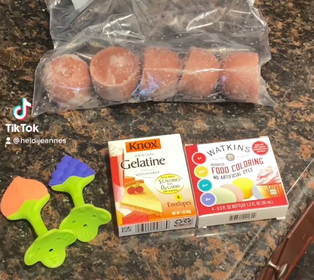 Step Three, Pour your Jell-O into the bin along with your teething toys. Refrigerate for 4 hours or overnight.